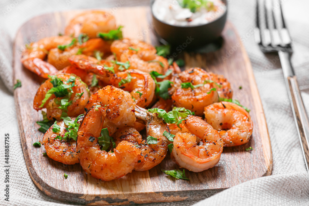 Tableau sur toile Wooden board of tasty shrimp tails on table