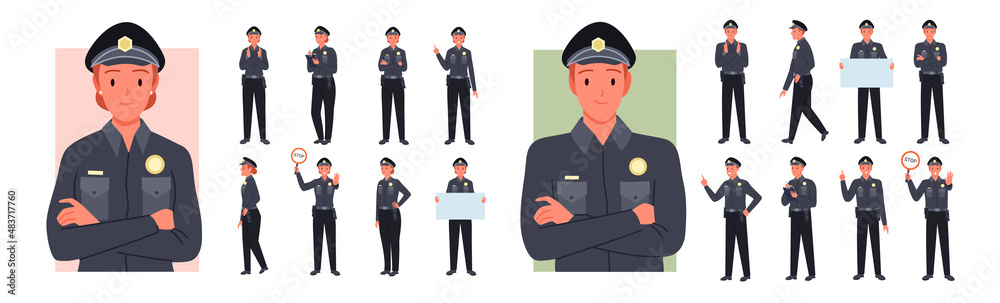 Tableau sur toile Police man and woman, guard poses set vector illustration
