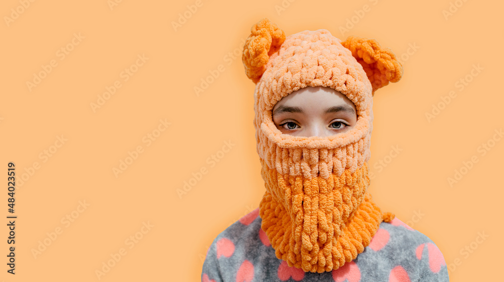 A teenage girl is dressed in a balaclava with bear ears, knitted with her own hands using alize puffy threads. New hat style.