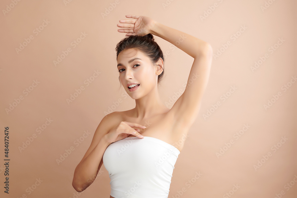 Beautiful Young Asian woman lifting hands up to show off clean and hygienic armpits or underarms on beige background, Smooth armpit cleanliness and protection concept