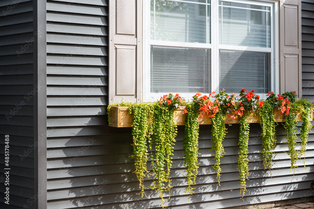Tableau sur toile A flower box of orange flowers and green hanging vines