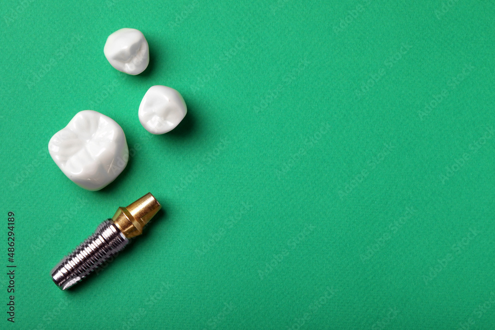 Tableau sur toile Post and abutment of dental implant near different crowns on green background, flat lay