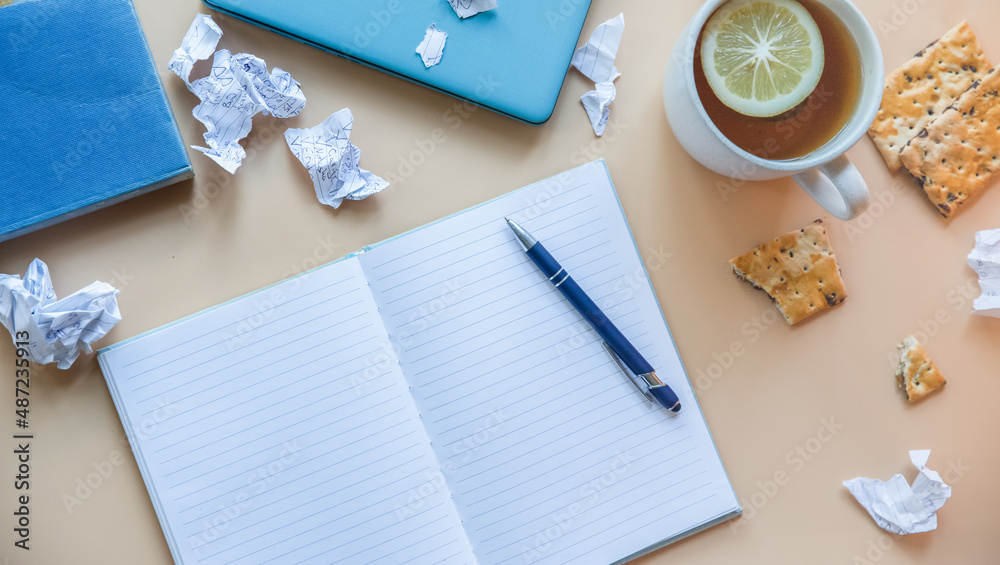 Tableau sur toile flatlay of home office or working space with notebook, book, cup of tea and cookies