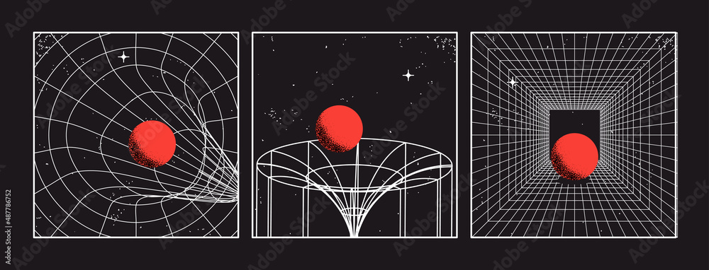 Tableau sur toile Abstract background set with teleportation or molecular physics concept with vintage styled grid funnel and tunnel and red ball going through it on black background