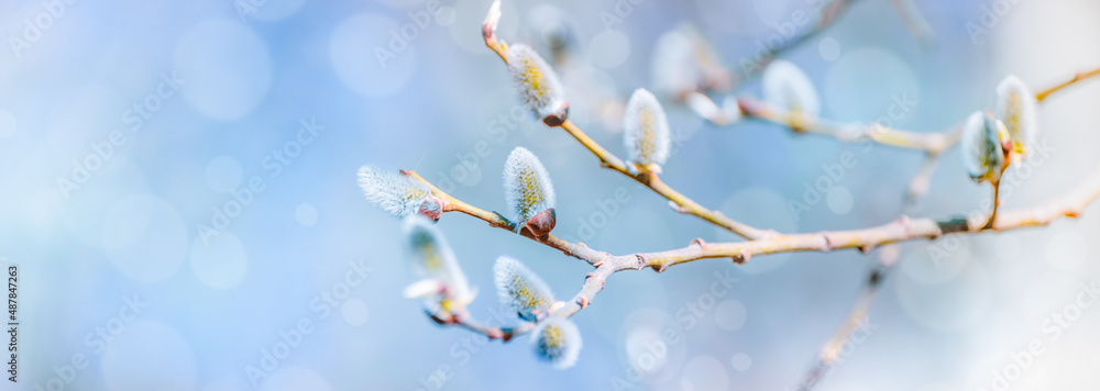 Tableau sur toile Spring branches of pussy willow on colorful blurred background