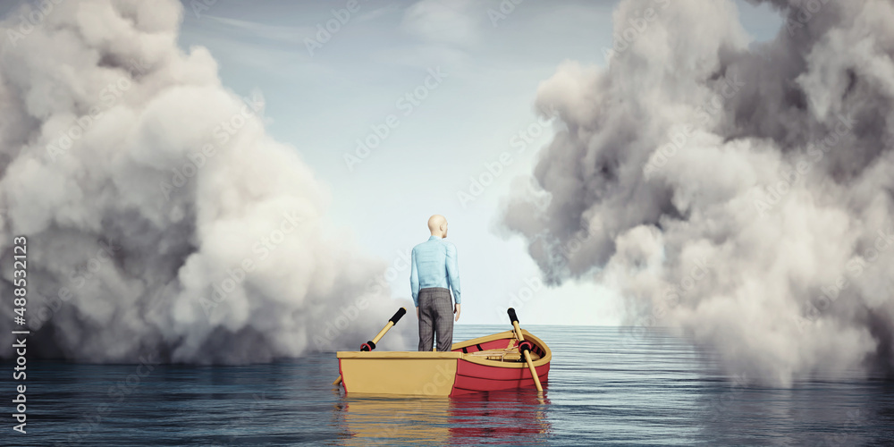 Tableau sur toile Man in a boat on sea getting through clouds.