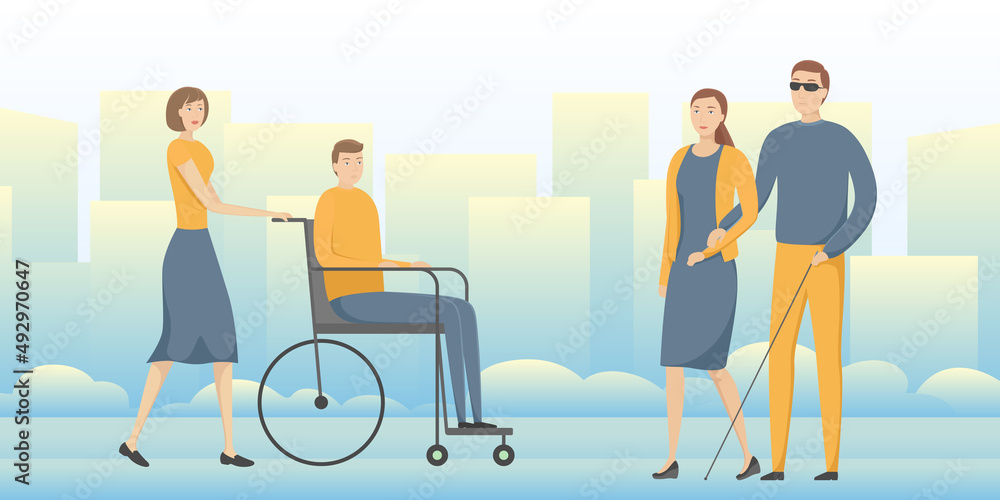 Tableau sur toile Person with blindness and person with disability walking with their aides