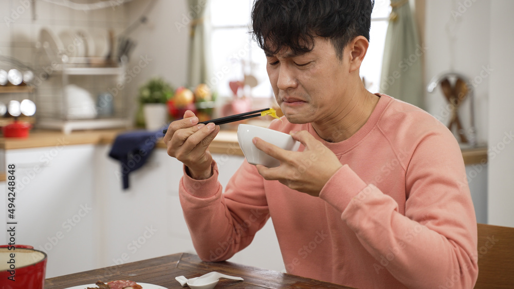 Tableau sur toile portrait of asian father making expression of disgust while tasting food with chopsticks and bowl at home dining table alone