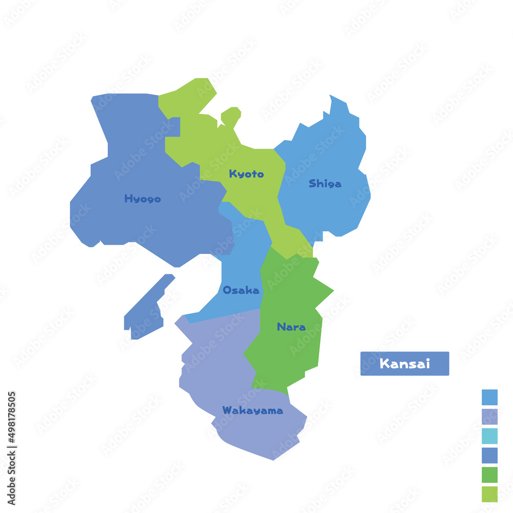 Tableau sur toile 日本の地域図・日本地図 関西地方 雨の日カラーで色分けしてみた(英語版)