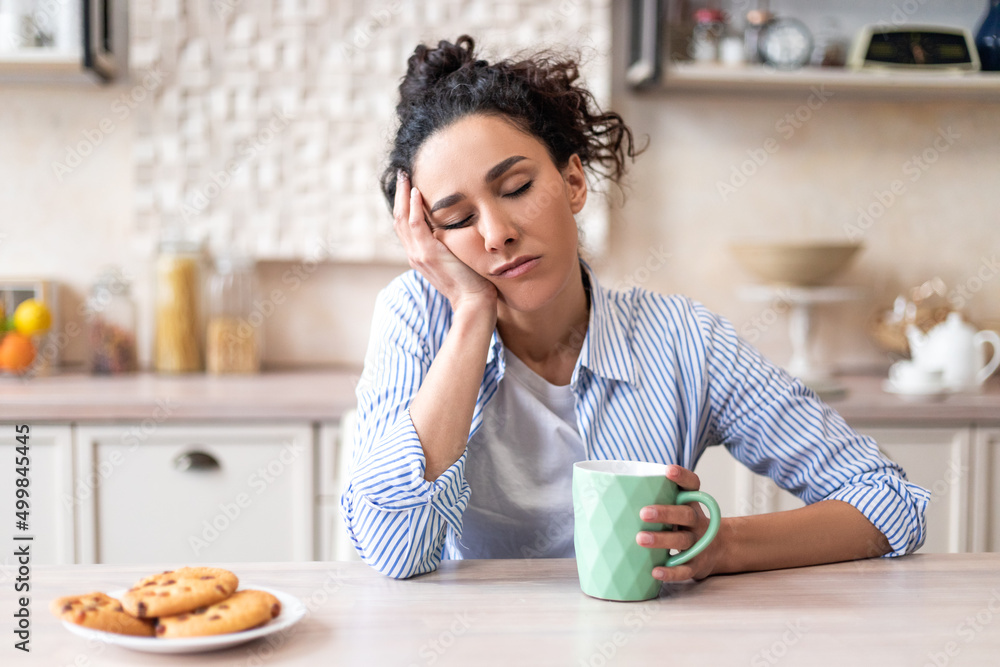 Tableau sur toile Sleepy young woman sitting at dining table in kitchen with closed eyes, holding