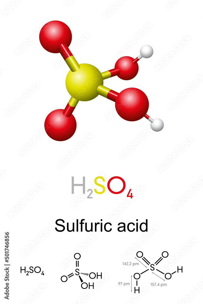 Tableau sur toile Sulfuric acid, H2SO4, ball-and-stick model, molecular and chemical formula with binding lengths