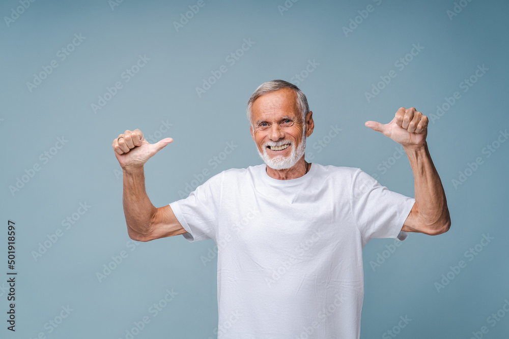 Tableau sur toile Happy senior man in white t-shirt shows thumbs-up gesture with hands smiling
