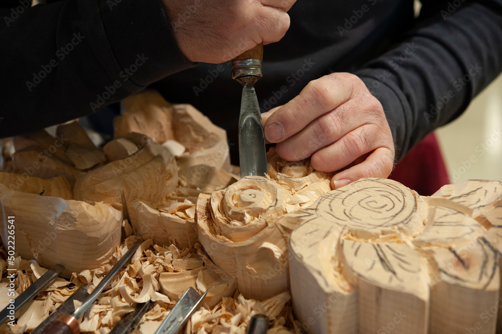 Master woodcarver at work. Wood shavings, gouges and chisels on the workbench.