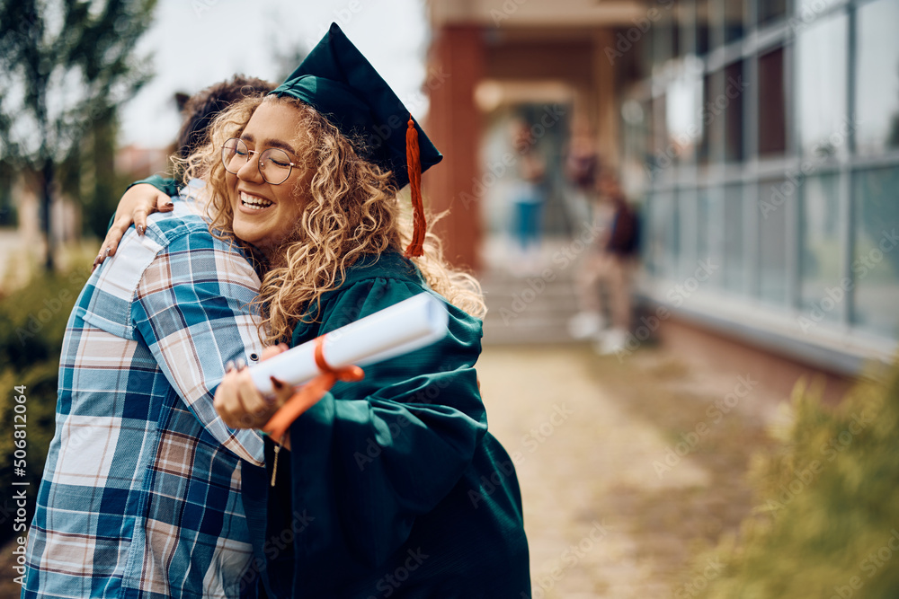 Tableau sur toile Happy graduate student embraces her father after graduation ceremony
