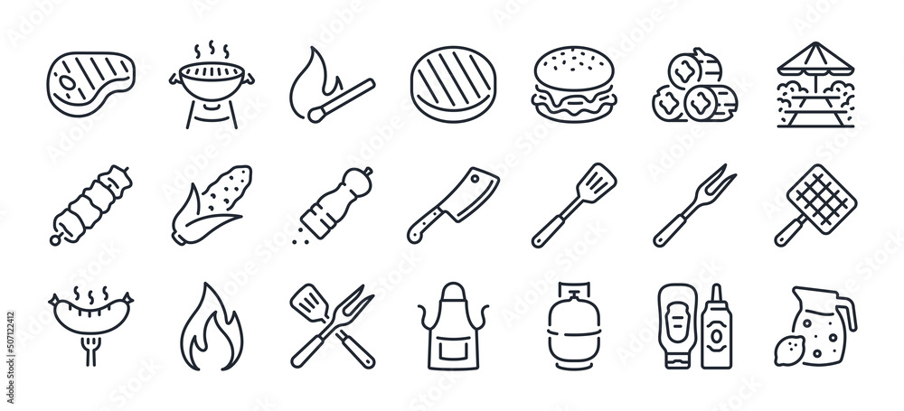 Tableau sur toile BBQ barbecue and grill related editable stroke outline icons set isolated on white background flat vector illustration