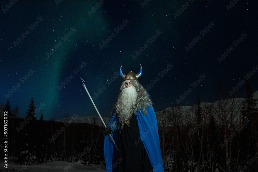 Tableau sur toile old man Odin with a staff stands in the snow at night against the backdrop of th