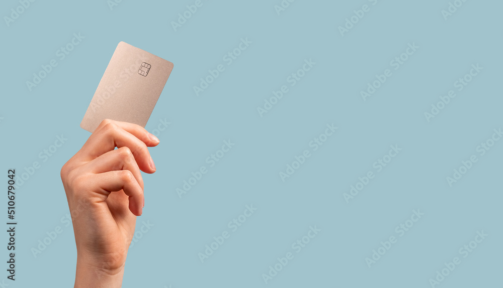 Tableau sur toile Banner with hand holding credit card mockup with chip on blue background