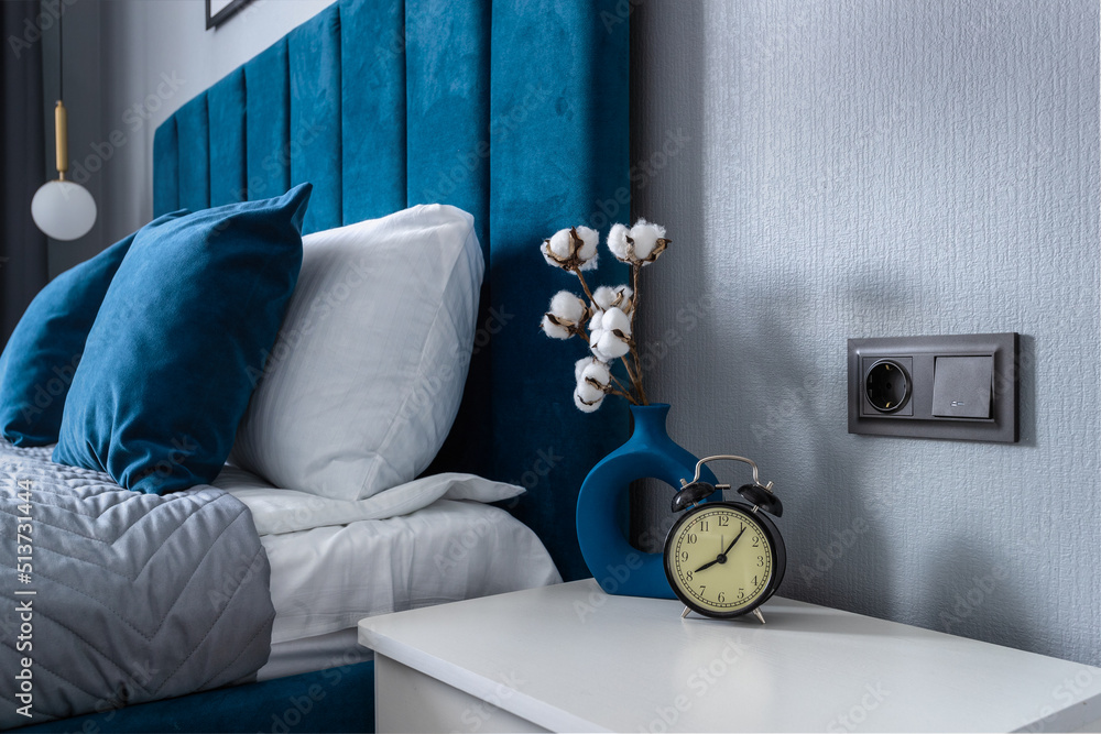 Tableau sur toile Analog clock alarm clock on the nightstand by the bed against the background of