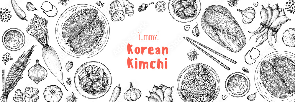Tableau sur toile Kimchi cooking and ingredients for kimchi, sketch illustration