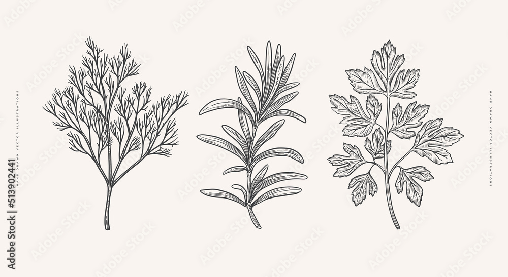 Tableau sur toile Branches of rosemary, cilantro and dill on a light background isolated