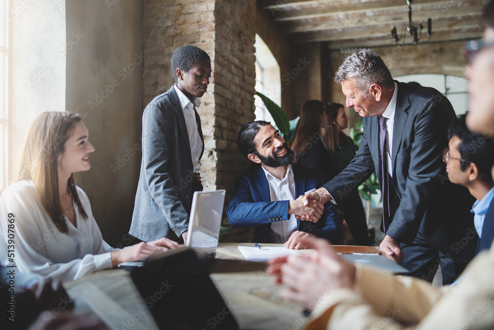Tableau sur toile Two businessmen make a deal by shaking hands sitting at a table together with ot