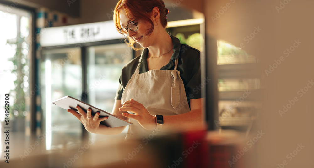 Tableau sur toile Cheerful store owner using a digital tablet in her grocery store