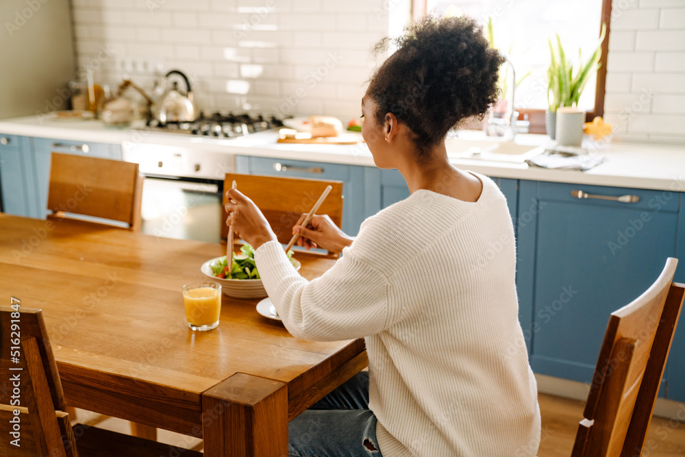 Tableau sur toile Back view of african woman sitting by table eating salad