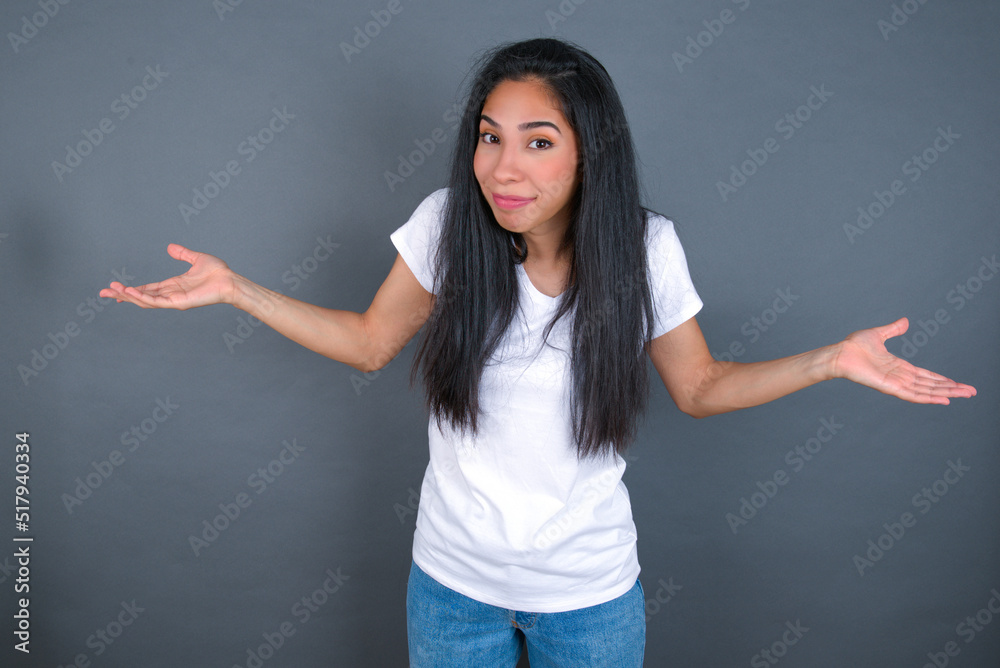 Tableau sur toile Puzzled and clueless young beautiful brunette woman wearing white t-shirt over grey background with arms out, shrugging shoulders, saying: who cares, so what, I don't know