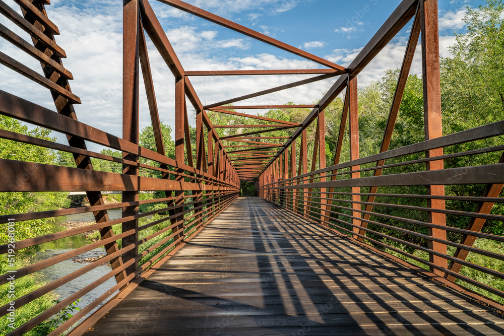 Tableau sur toile bike trail and a long footbridge over a river - Cache la Poudre River in Fort Co