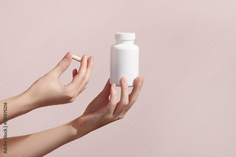 Woman holding pill and blank white plastic tube on pink background. Packaging for pill, capsule or supplement. Medic product branding mockup.