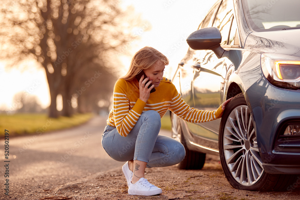 Tableau sur toile Woman Calling For Help On Phone After Car Breakdown On Country Road With Tyre Pu