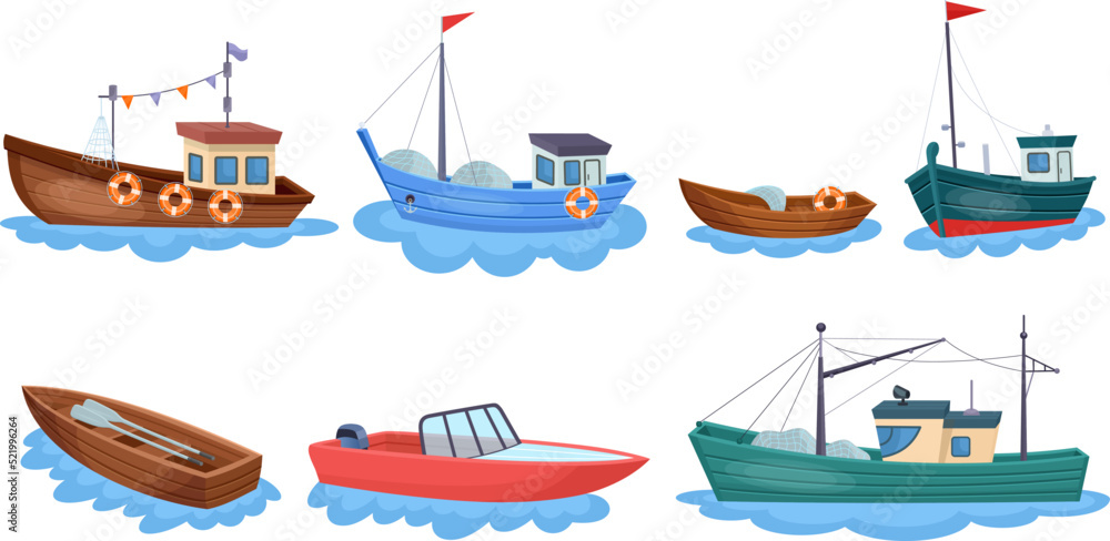 Boats with fishing nets. Fisherman boat marine ship sea ocean fisheries for fish production industrial seafood shippings water vessel fishery towboat, neoteric vector illustration