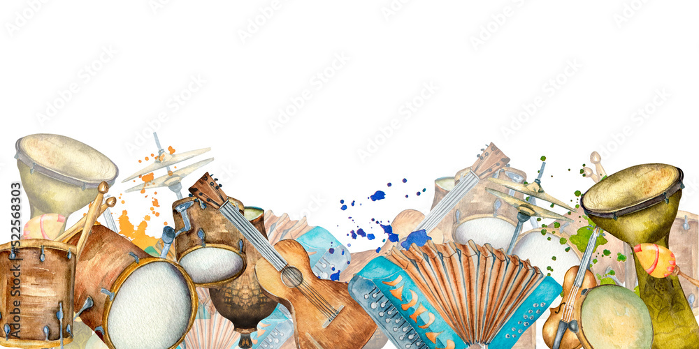 Tableau sur toile Banner of latin musical instruments watercolor illustration isolated
