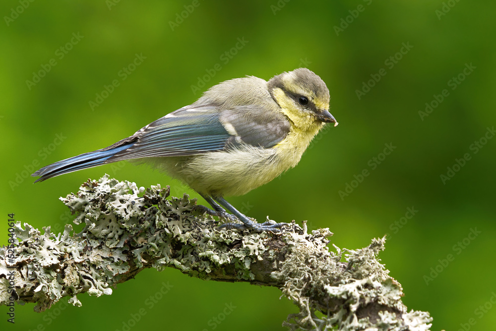 Tableau sur toile Eurasian blue tit (Cyanistes caeruleus) juvenile sitting on a branch in summer