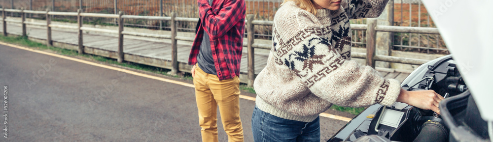 Tableau sur toile Woman repairing broken down campervan while her husband calls on the phone