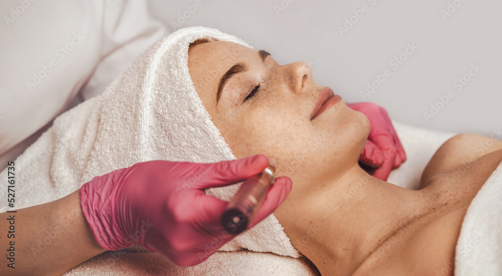 Tableau sur toile Professional beautician using derma pen on woman's face skin, at spa salon