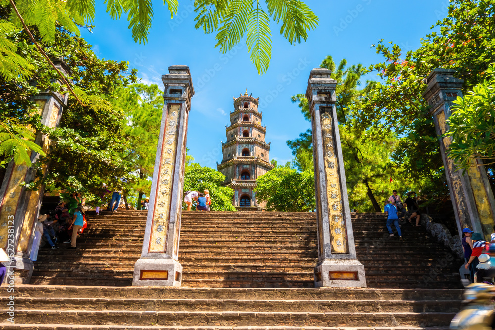 Tableau sur toile view of The Thien Mu Pagoda with many tourists