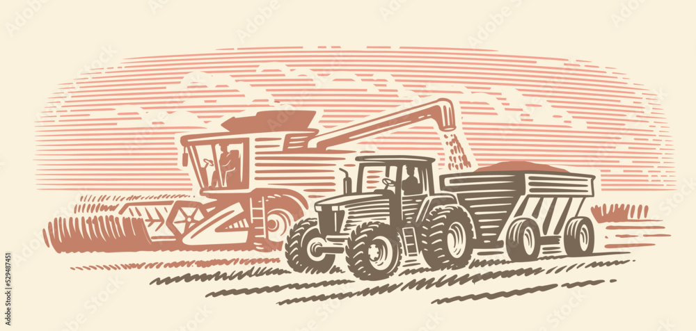 Tableau sur toile Combine harvester working with tractor. Sketch