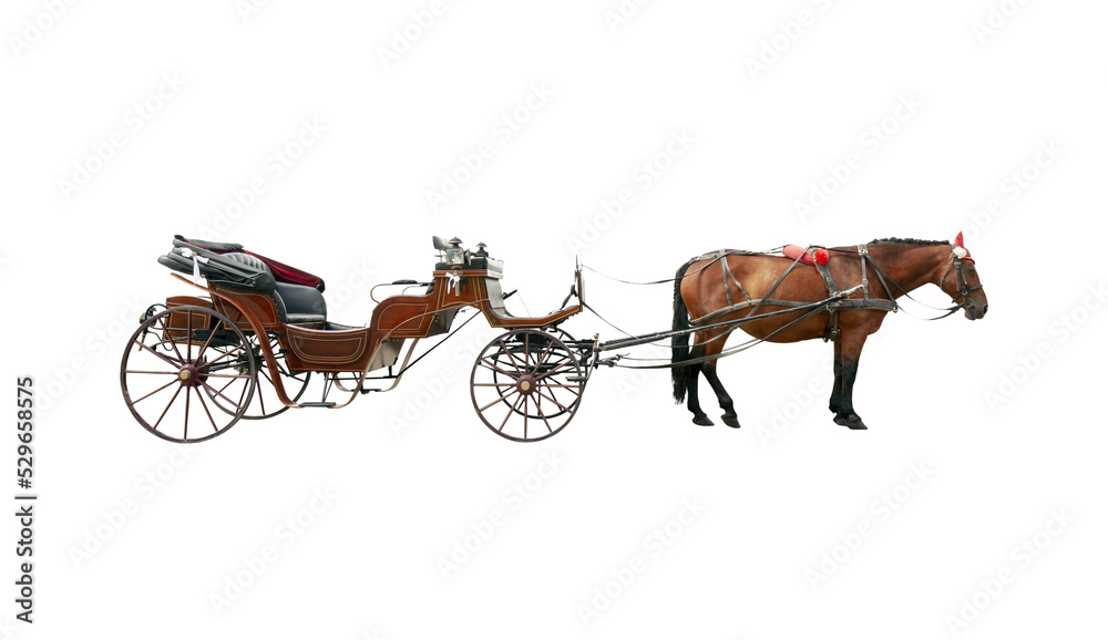 Tableau sur toile Brown horse and old classic open carriage coach isolated