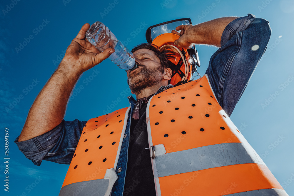 Tableau sur toile Arbeiter in Sicherheitskleidung schwitzt in der Sonne