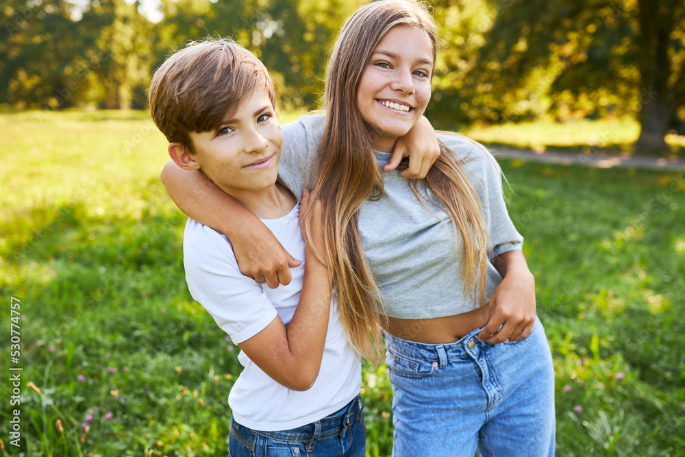 Tableau sur toile Geschwister stehen Seite an Seite und lächeln cool