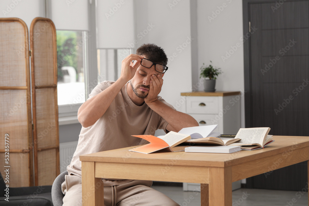 Tableau sur toile Sleepy man studying at wooden table indoors