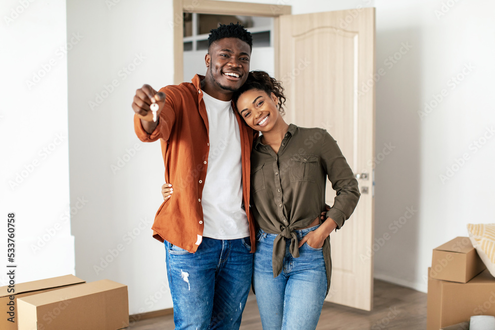 Tableau sur toile African American Millennial Couple Showing Key Posing In New House