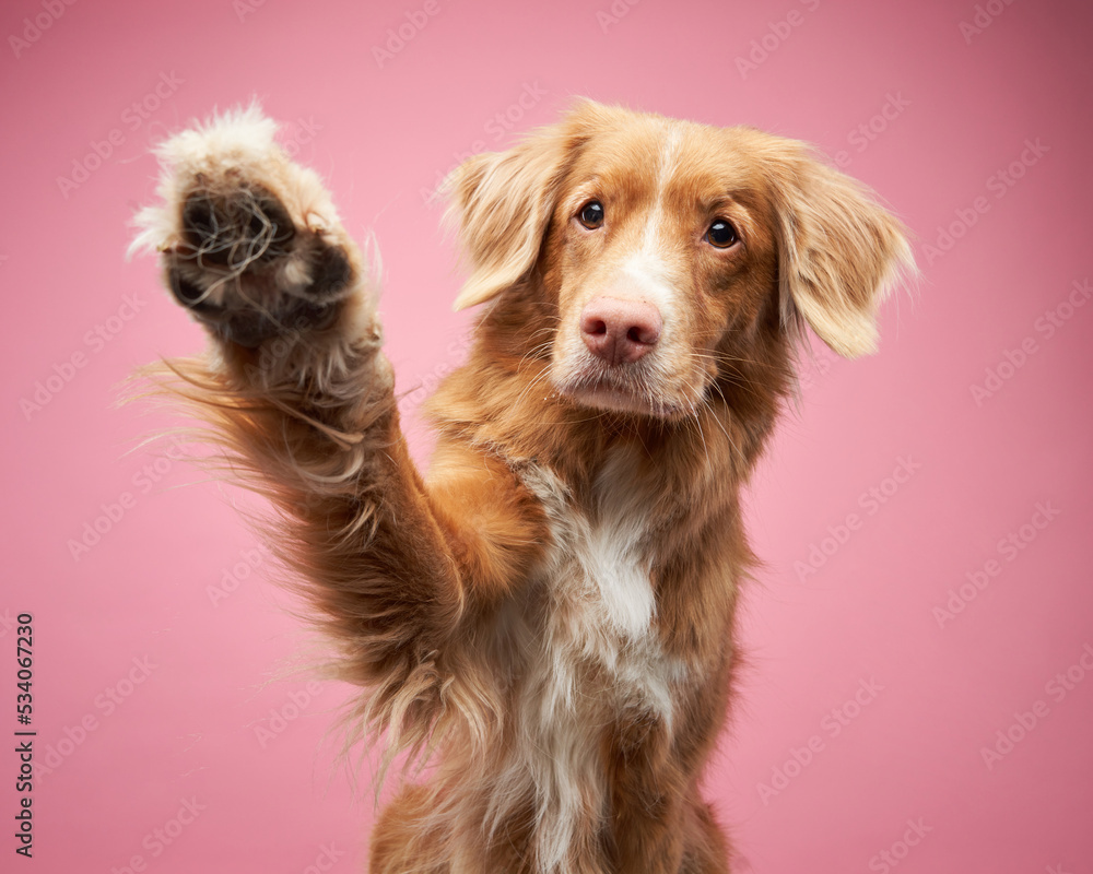 Tableau sur toile dog waving its paws on a pink background, in the studio