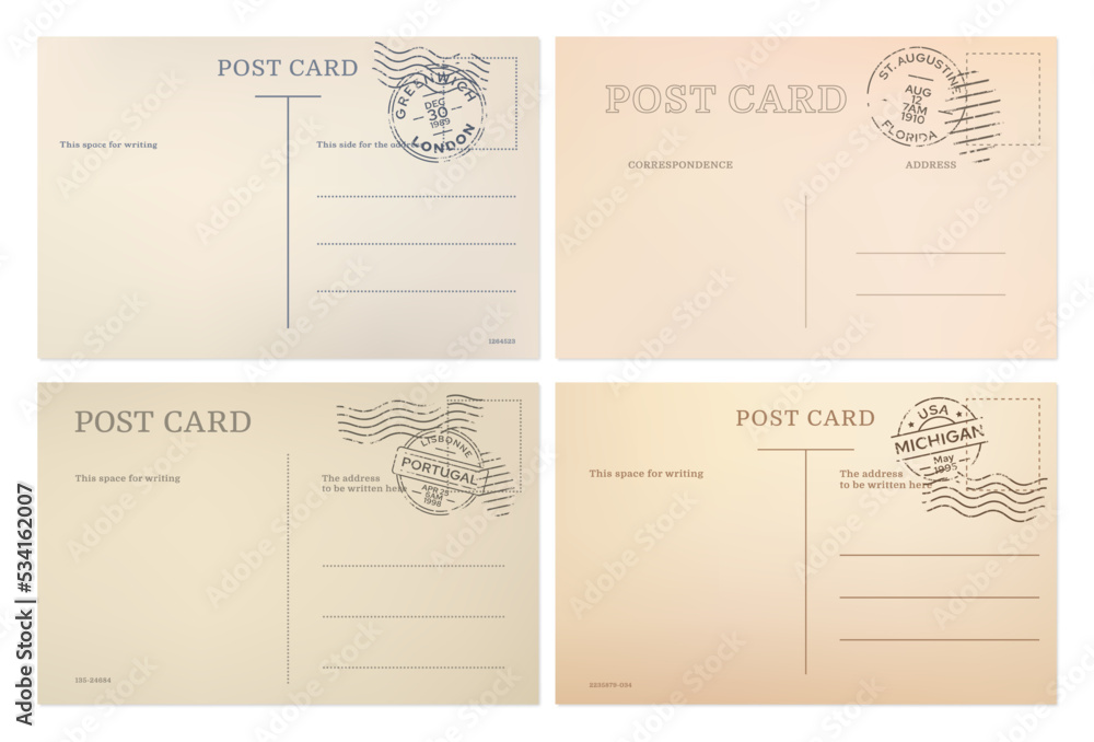 Tableau sur toile Vintage postcard, post card templates with postal stamps, vector backgrounds