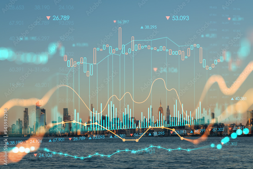Tableau sur toile New York City skyline from New Jersey over Hudson River with Hudson Yards skyscrapers at sunset