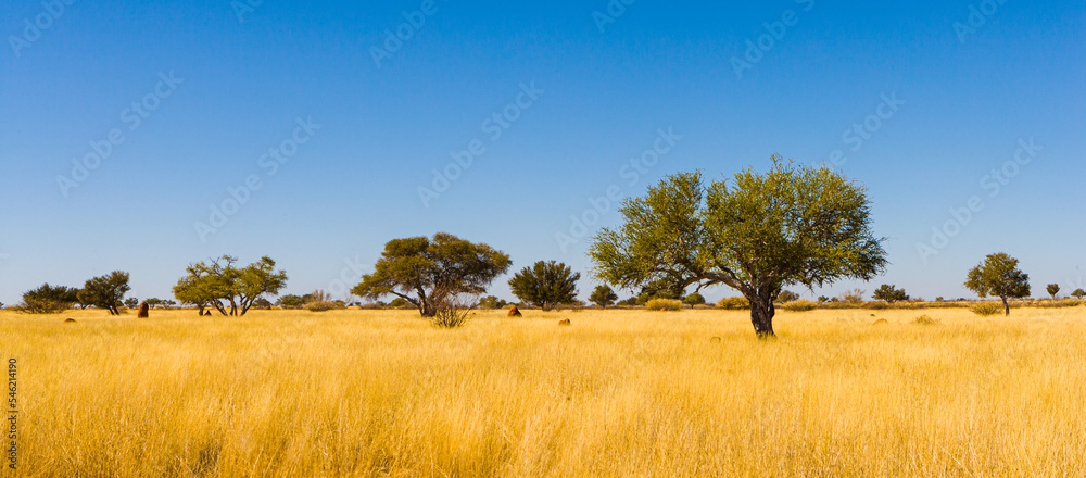 Tableau sur toile Typical savanna landscape with yellow grass and isolated trees in the Kalahari d