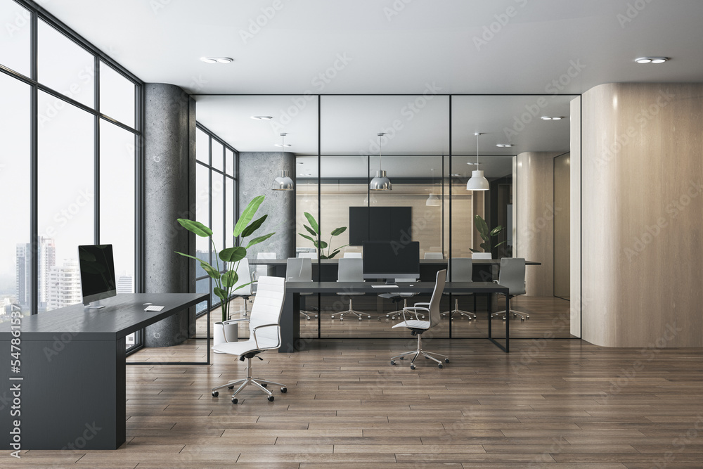 Tableau sur toile Luxury wooden, concrete and glass coworking office interior with furniture, equipment, window and city view