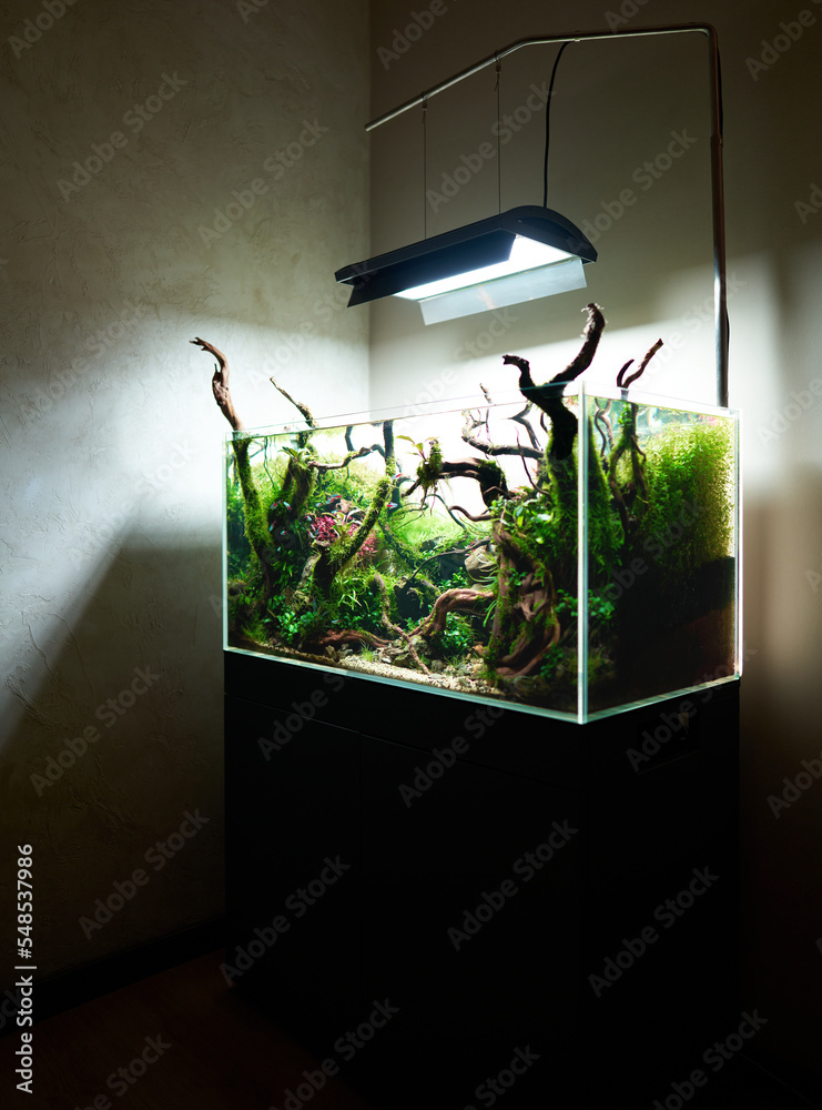Tableau sur toile Corner view of beautiful freshwater aquascape with live aquarium plants, Frodo stones, redmoor roots covered by java moss and a school of blue neon tetra fish