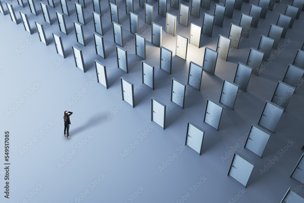 Tableau sur toile Young businesswoman looking at row of multiple doors